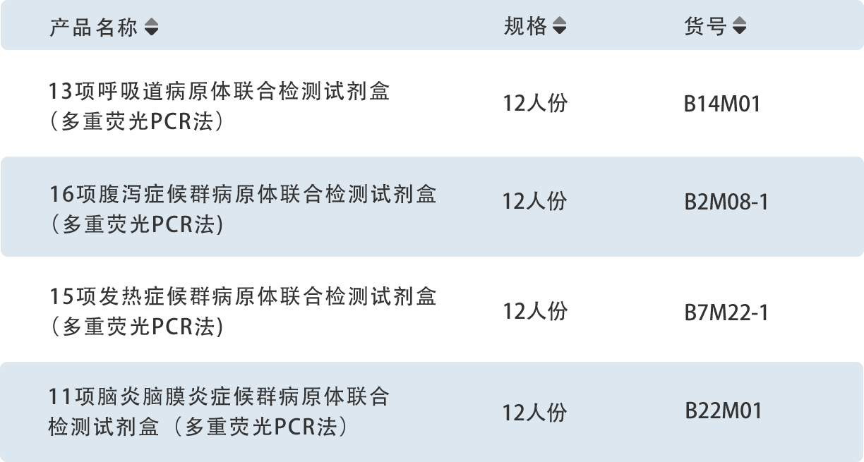 随着“传染病监测技术平台”项目推进,艾克韦生物开发了多种多重联合检测试剂盒,支持快速、准确识别呼吸道、腹泻、发热、脑炎等症候群的病原体,检测时间短至40分钟,灵敏度高且特异性强。产品可根据需求定制组合方案,覆盖多种症候群的全病原体,兼容国内外主流荧光定量PCR仪器,助力流行病学调查和防控策略实施。
